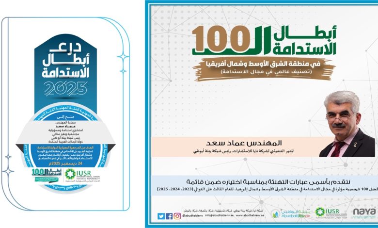 تحتفي شبكة بيئة أبوظبي اليوم بإنجاز عربي جديد، يتمثل في اختيار المهندس عماد سعد ضمن قائمة أبطال الاستدامة لعام 2025 في منطقة الشرق الأوسط وشمال إفريقيا، والتي يمنحها الاتحاد الدولي للمسؤولية المجتمعية، ويأتي هذا التكريم للعام الثالث على التوالي (2025 – 2024 – 2023)، في تأكيدٍ على دوره الريادي وتأثيره المستدام في قيادة الوعي البيئي والعمل المناخي في العالم العربي.