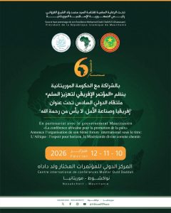 تحت رعاية سامية من فخامة رئيس الجمهورية الإسلامية الموريتانية، السيد محمد ولد الشيخ الغزواني، تستضيف العاصمة نواكشوط الملتقى الدولي السادس للمؤتمر الإفريقي لتعزيز السِّلم، خلال الفترة الممتدة من 10 إلى 12 فبراير 2026، وذلك بالمركز الدولي للمؤتمرات – المختار ولد داداه (قصر المؤتمرات القديم).