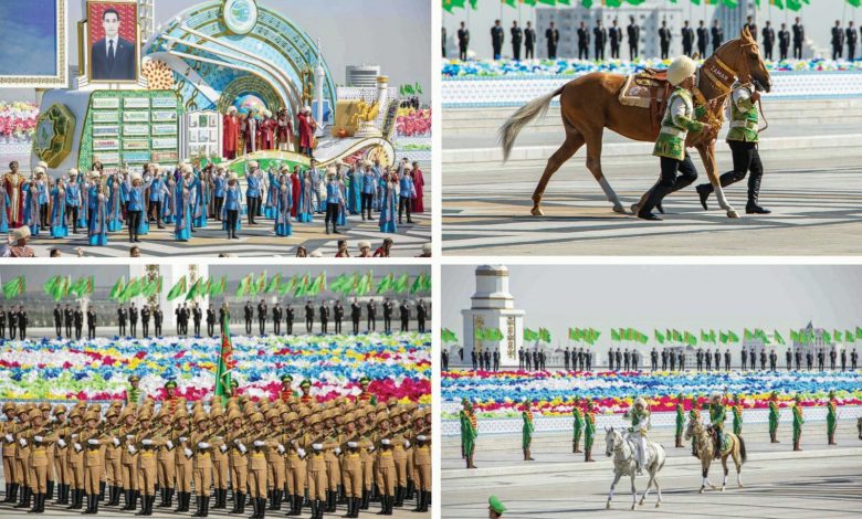 ومن المشاهد الملفتة للنظر هو اصطحاب فارسان يرتديان الزي الوطني حصانًا رائعًا من نوع “أخال تيكي” ذو المكانة التاريخية والتراثية لدى التركمان إلى الساحة، ثم انطلقت مواكب السيارات المزينة بأسلوب احتفالي، كاشفةً عن إنجازات ونجاحات مختلف قطاعات الاقتصاد الوطني في بلدنا، واحدة تلو الأخرى، وكان هذا الموكب المهيب دليلاً آخر على إنجازات تركمانستان الاقتصادية والتنموية والاجتماعية.